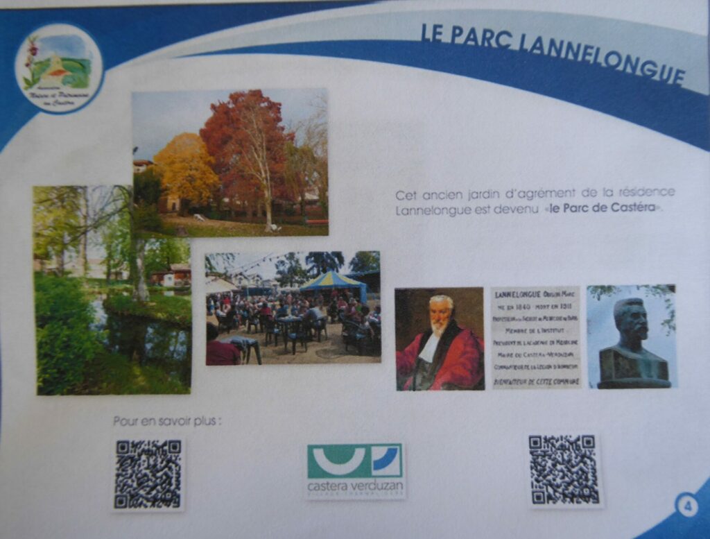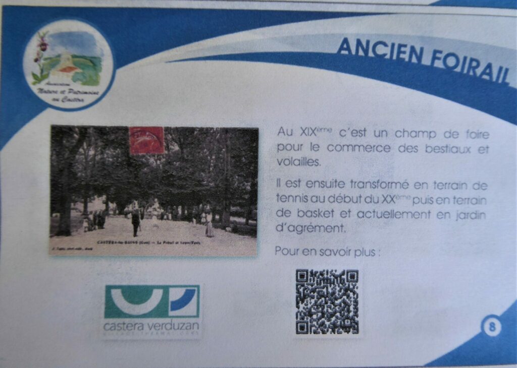 Ces journées seront peut-être pour vous une occasion de découvrir notre village de Castéra-Verduzan. Notre association a crée un Parcours Urbain avec panneaux explicatifs et QR codes sur l’Histoire et le Patrimoine du village. Le point de départ se situe derrière la Mairie Place Aubert Garcia où vous trouverez affiché le plan du parcours. Prenez le en photo pour vous guider vers chacune des 12 stations.